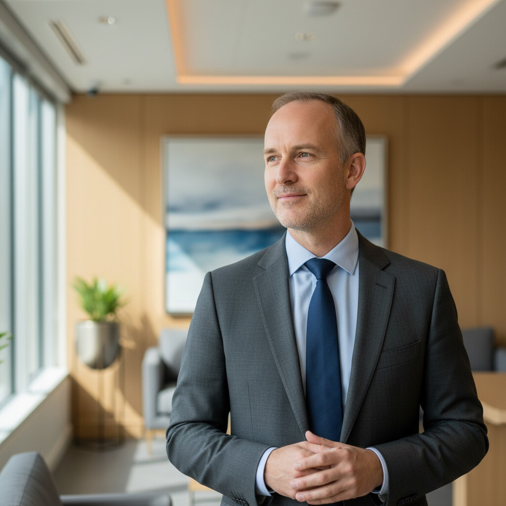 Prompt: A calm, professional individual (male, 40s) looking thoughtfully into the distance, with a subtle, naturally progressing hairline. The background is a softly blurred, modern clinic interior. The image should convey confidence and a positive outlook on hair restoration. Alt: Man with a natural hairline considering hair restoration. ImageName: hairline_progression_safety