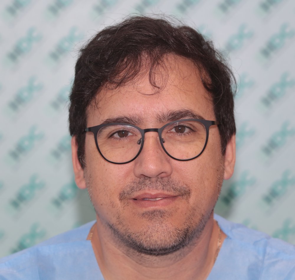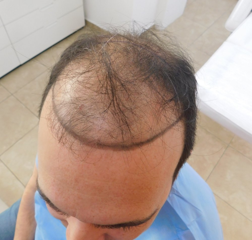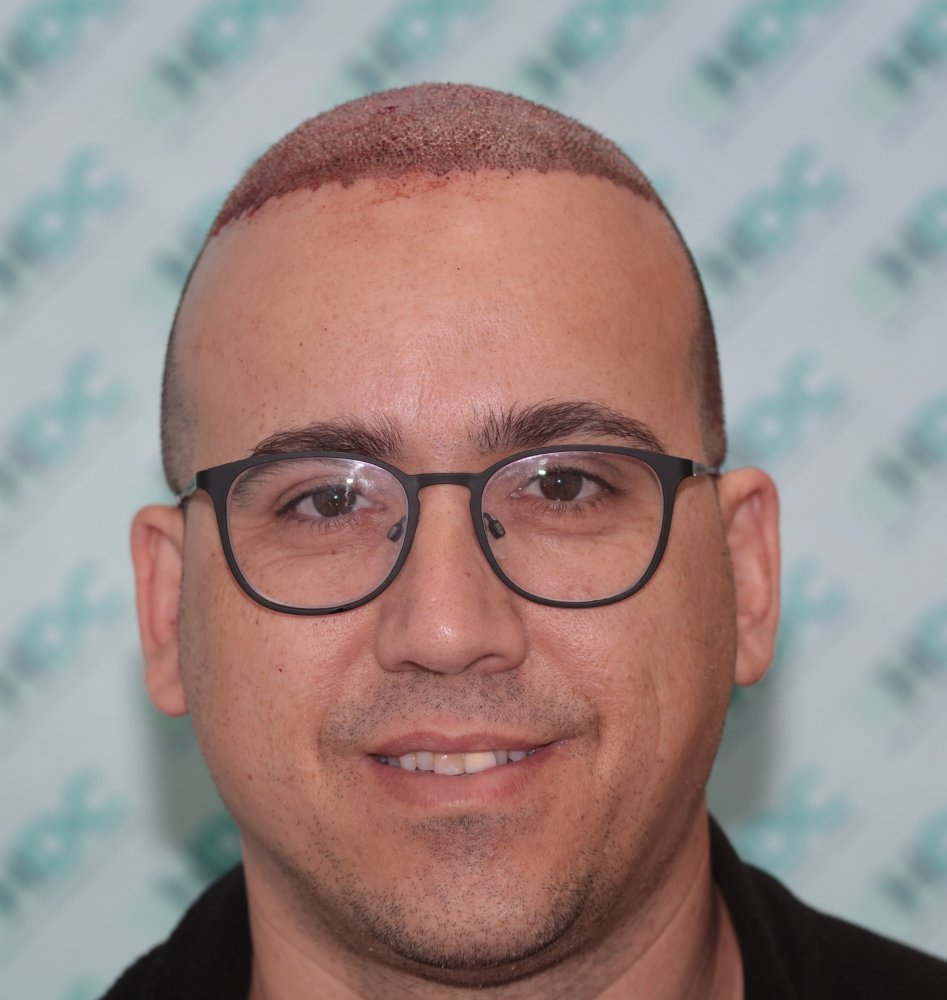 The grafts were strategically distributed to cover a wide bald area. The patient later returned for a 2nd FUE session to address the crown region. This will be presented also in the future. - Natural Hairline Design: