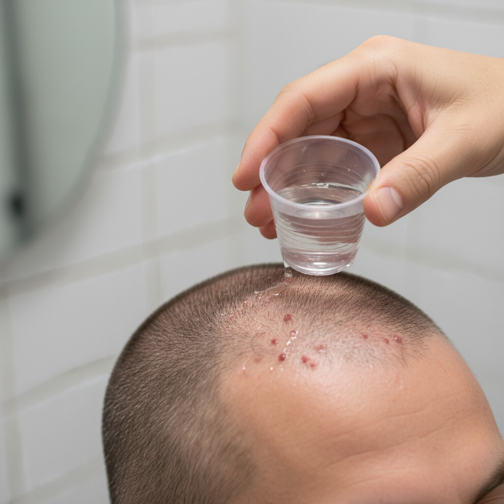 Prompt: A person gently dabbing their scalp with a cup filled with a clear liquid, following hair transplant surgery. The focus is on the gentle technique. No text.