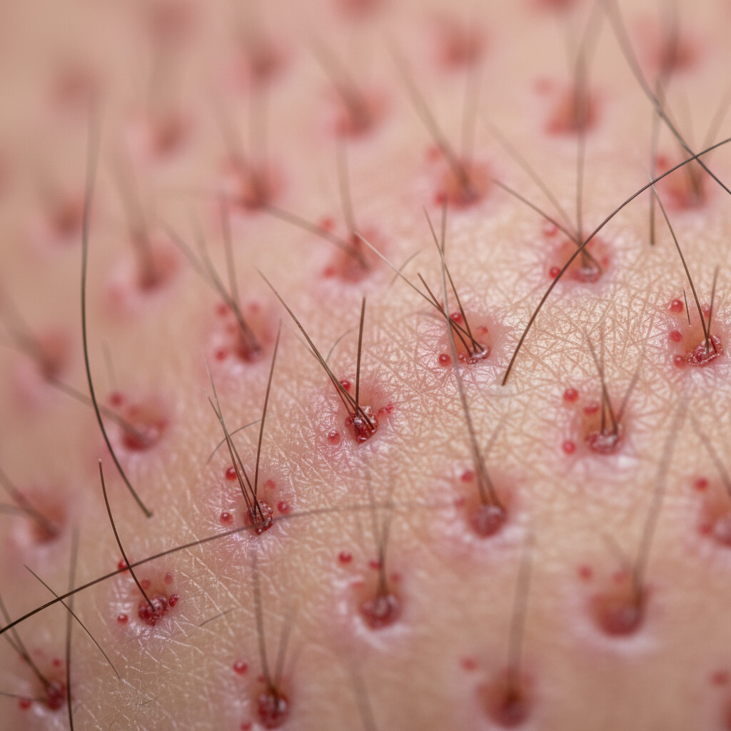 Prompt: Close-up, macro view of a few newly transplanted hair follicles on a scalp, showing tiny red dots indicating insertion points. The focus is on the delicate nature of the grafts. No text.