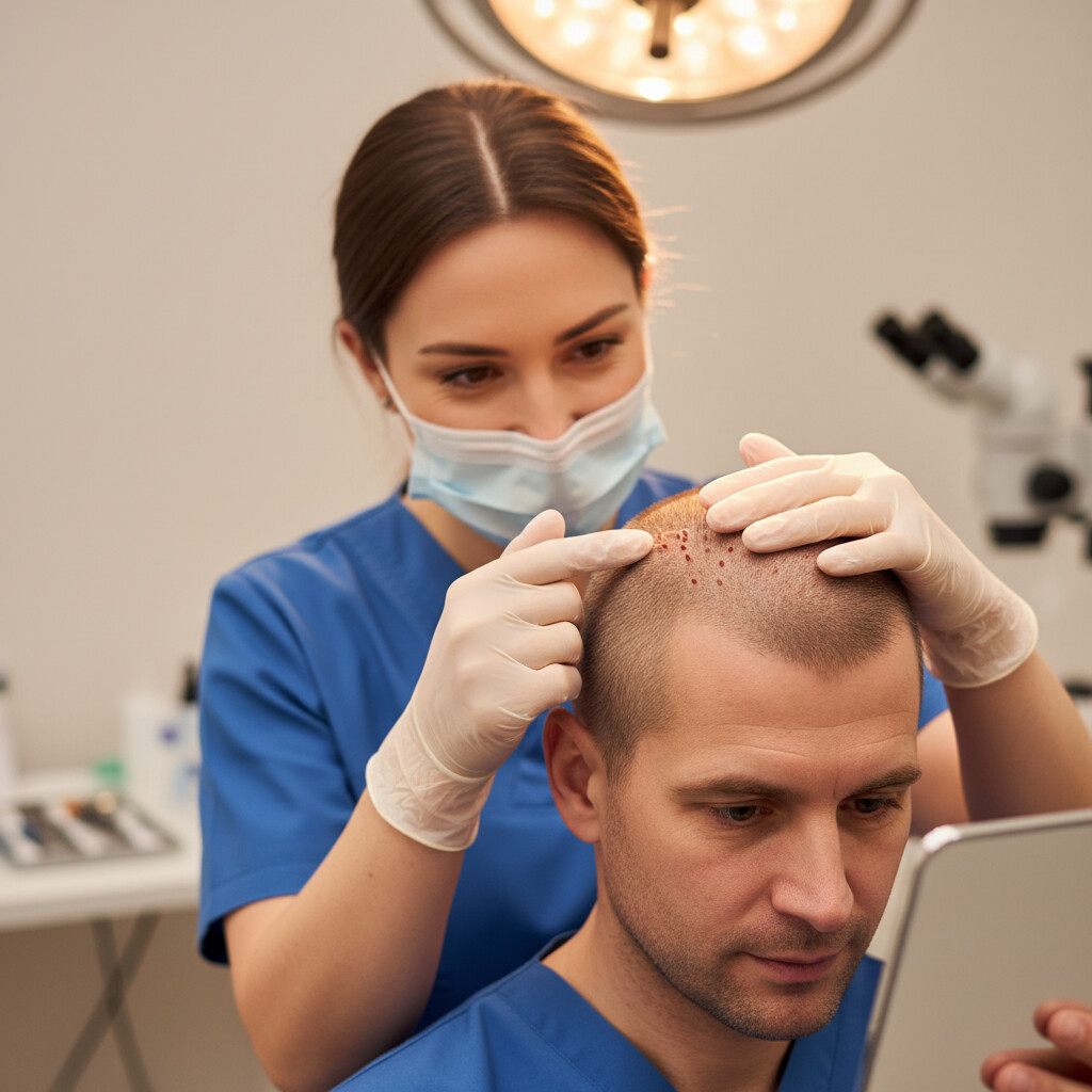 Prompt: A medical professional gently examining a patient’s scalp after a hair transplant, pointing out a specific area. The scene conveys care and monitoring. No text.